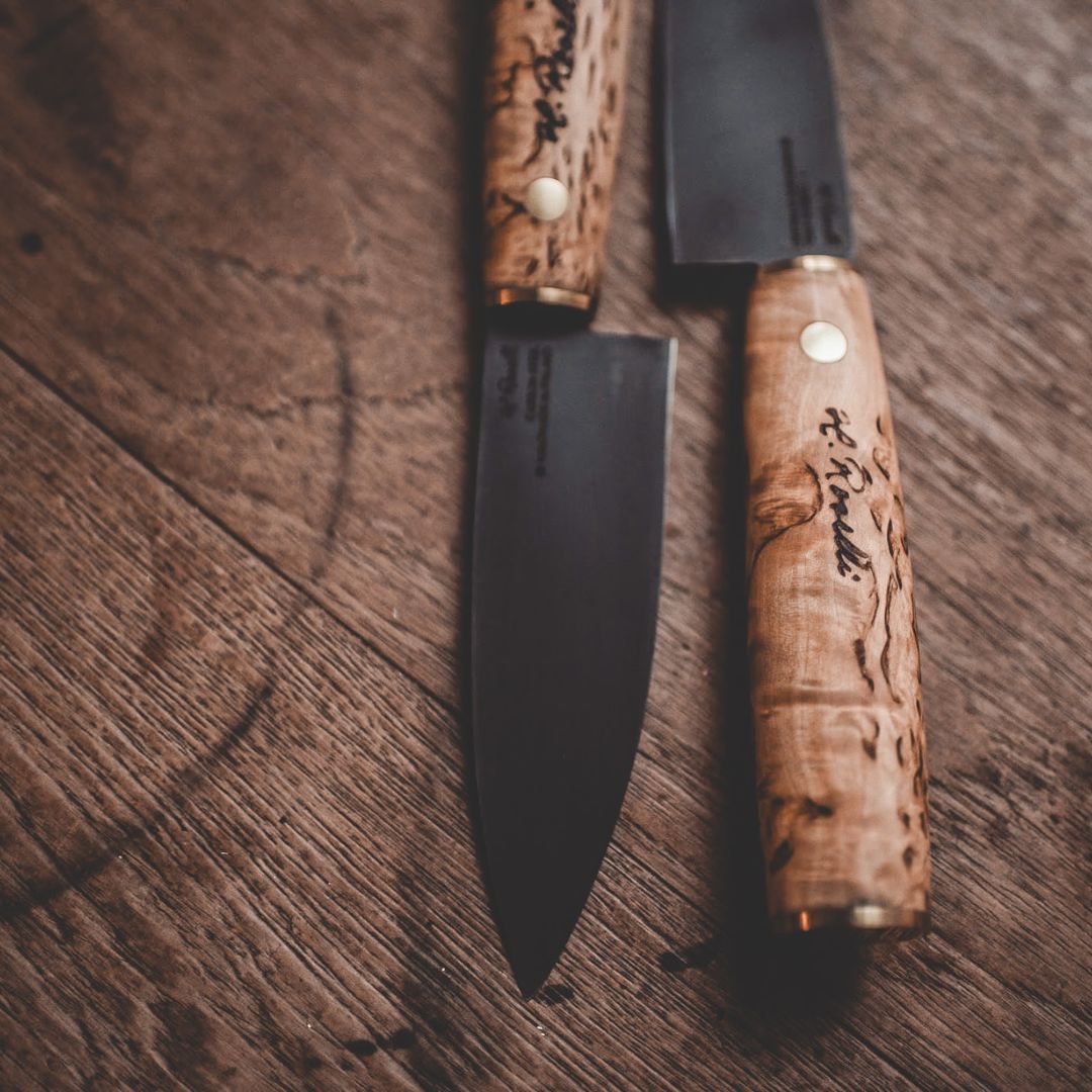 Our Japanese-inspired chef knives embody the perfect blend of Finnish tradition and modern craftsmanship. Designed with precision and elegance, each knife features a razor-sharp blade made from carbon steel and ergonomic handles, ensuring exceptional performance and comfort. These knives are ideal for both professional chefs and passionate home cooks seeking precision and artistry in their kitchen tools.
